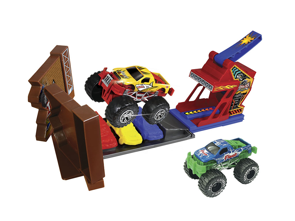 Set includes 2 pcs of exclusive decorated die cast Monster Trucks, crushed cars mold and launcher to play with a great crashing and smashing action.
